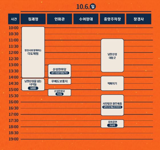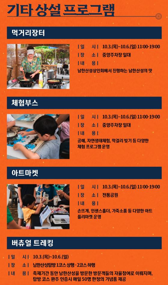 남한산성도립공원에 있는 문화재와 여러 공간에서 다양한 프로그램이 진행되며, 남한산성의 역사와 현대의 이야기를 엮은 퍼레이드가 펼쳐집니다.