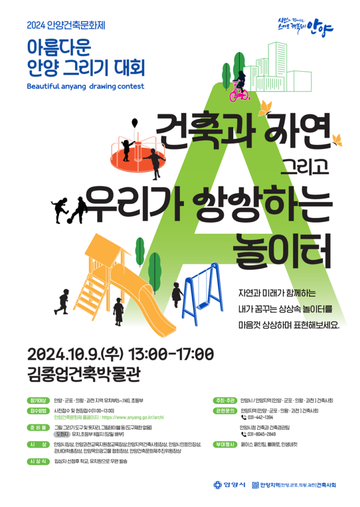 또 9일 오후 1시부터 5시까지 유치원생・초등학생이 참여하는 ‘아름다운 안양 그리기 대회’가 열릴 예정으로 현재 안양건축문화제 공식 누리집(anyang.go.kr/archi)에서 사전 접수가 진행 중이며, 현장 접수도 가능하다.
