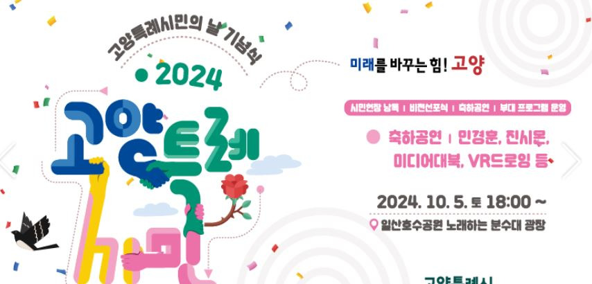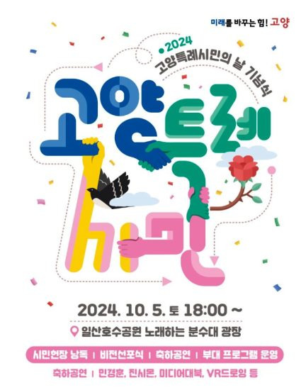고양특례시민의 날을 기념하며 시민과 함께 화합의 장 마련하기 위해 2024년 고양특례시민의 날 기념식이 2024년 10월 5일에 일산호수공원 노래하는 분수대 광장 일원에서 개최합니다.