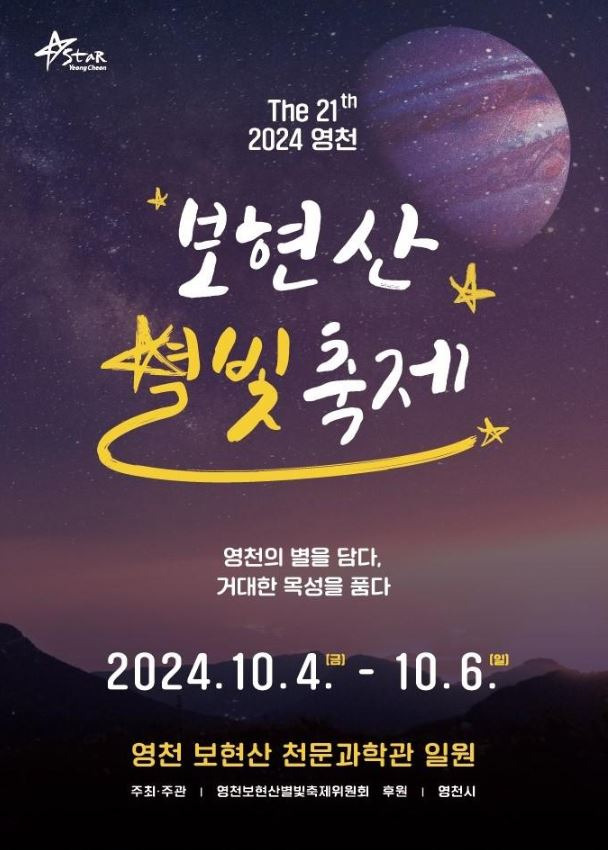 영천의 대표 축제인 보현산별빛축제가 ‘영천의 별을 담다, 거대한 목성을 품다’를 주제로 오는 4일부터 6일까지 영천 보현산천문과학관 일원에서 열린다. 영천은 별의 도시로, 청정 자연이 선사하는 아름다운 밤하늘과 국내 최대 광학 망원경을 갖춘 보현산 천문대 등 풍부한 천문과학 인프라를 자랑한다. 이번 축제는 단순히 즐기는 축제를 넘어 다양한 과학 체험 활동을 통해 우주의 원리를 배울 수 있는 유익한 내용으로 관람객들의 호응을 얻으며, 2024년 경상북도 지정축제 심사에서 6년 연속 우수축제로 선정된 바 있다.