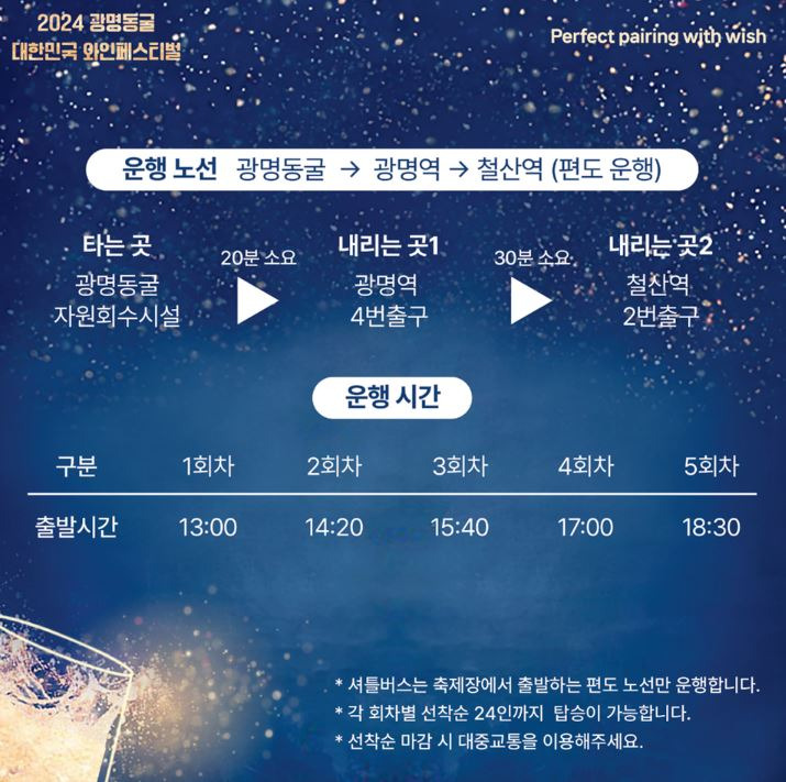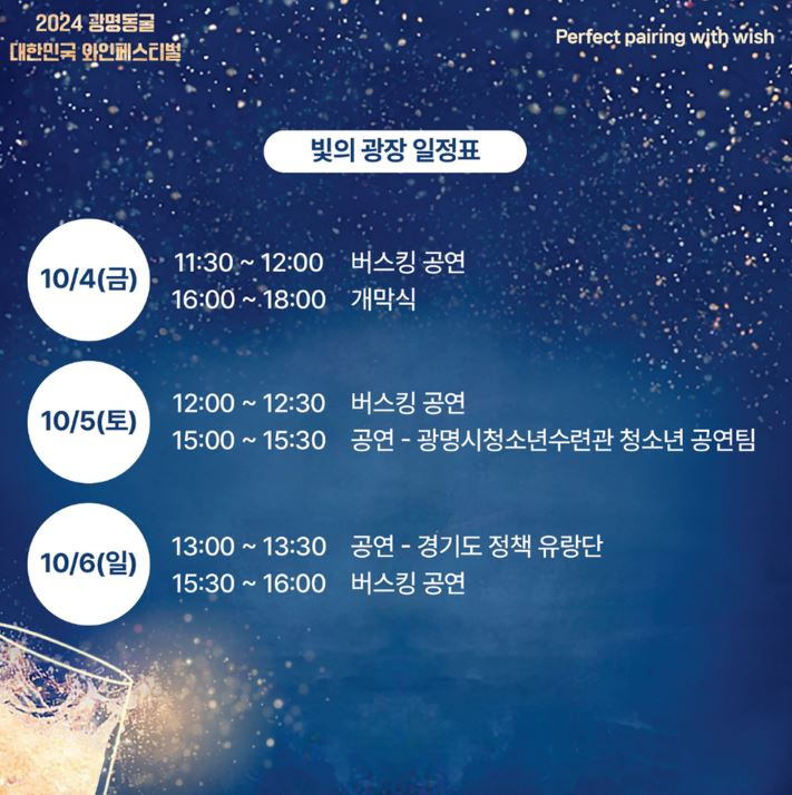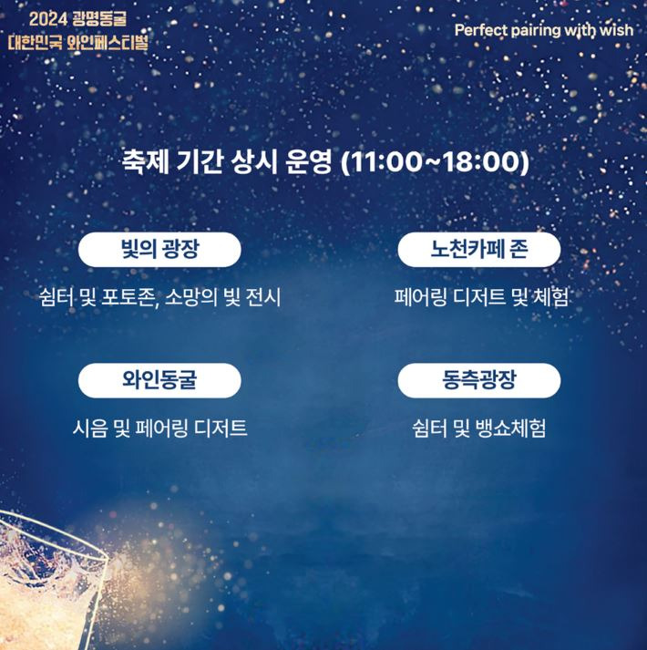 2024년 10월 4일부터 6일까지 사흘간 광명동굴 일원에서 광명동굴 대한민국 와인 페스티벌이 개최합니다.