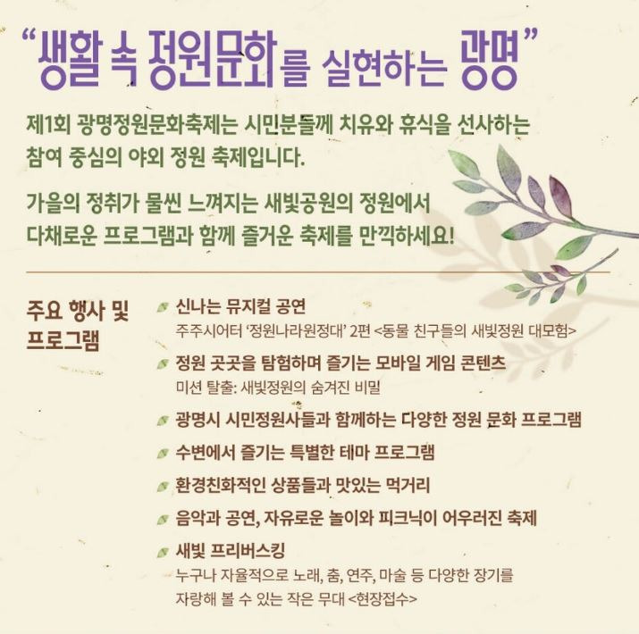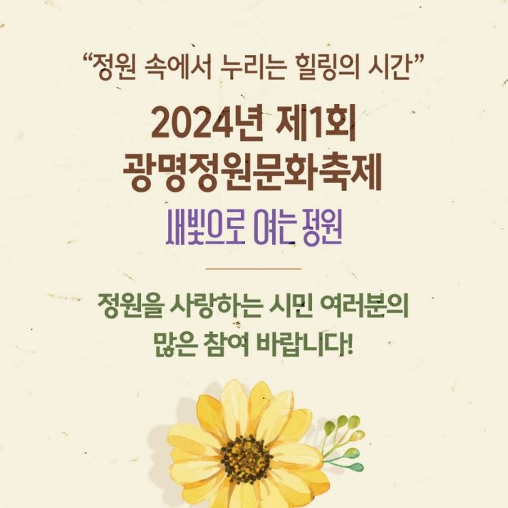 제1회 광명정원문화축제는 시민분들께 치유와 휴식을 선사하는 참여 중심의 야외 정원 축제입니다.