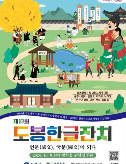 근대화에서 일제강점기 그리고 해방 이후까지 나랏말이 된 한글을 지키고 누리며 회복하는 역사를 담은 도봉한글잔치가 2024년 10월 2일부터 9일까지 방학동 원당샘공원에서 개최합니다.