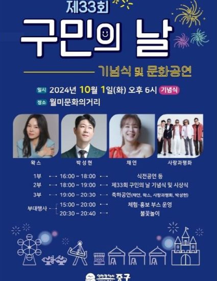 인천 중구 제33회 구민의 날 기념식 및 문화공연이 2024년 10월 1일 18시에 월미 문화의 거리에서 개최합니다.
