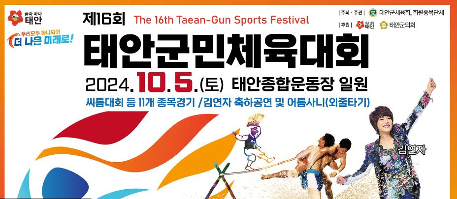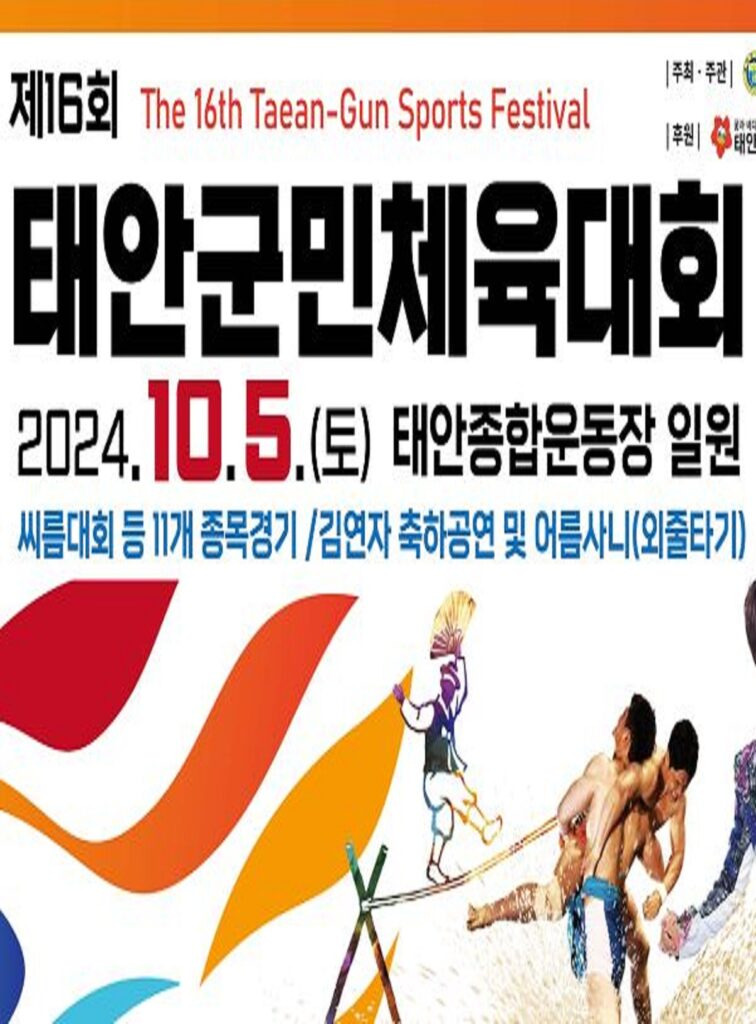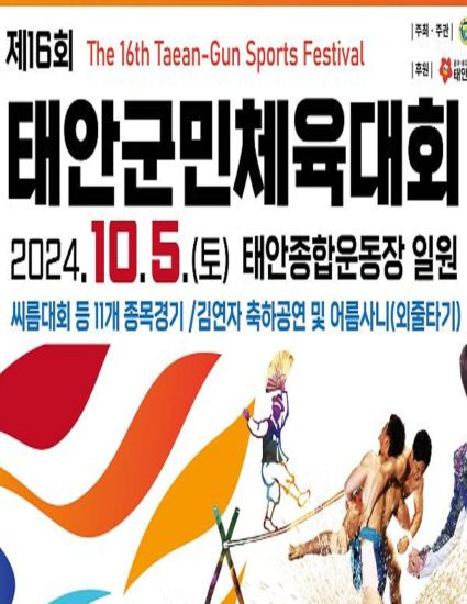군은 오는 10월 5일 하루간 태안종합운동장 및 각 종목별 경기장에서 8개 읍·면민과 출향군민이 참여한 가운데 제16회 태안군민체육대회가 개최될 예정이라고 27일 밝혔다.