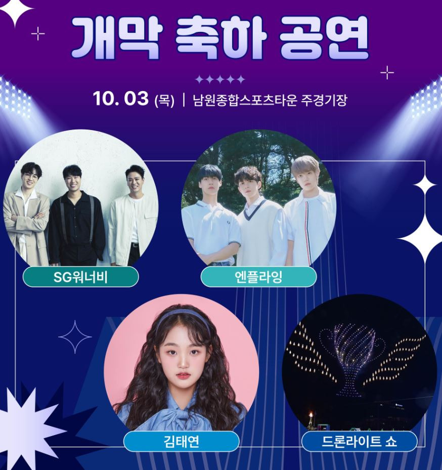 SG워너비, 김태연, 엔플라잉의 개막식 축하공연이 진행 될 예정입니다.