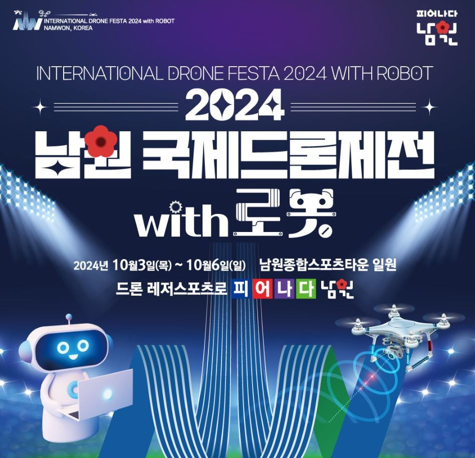 드론과 로봇 관련 스포츠대회와 전시뿐만 아니라 다양한 체험, 부대행사를 함께 준비하고 있는 2024 남원 드론 공연 체험 페스티벌이 2024년 10월 3일부터 6일까지 남원 종합스포츠타운 일원에서 개최합니다.
