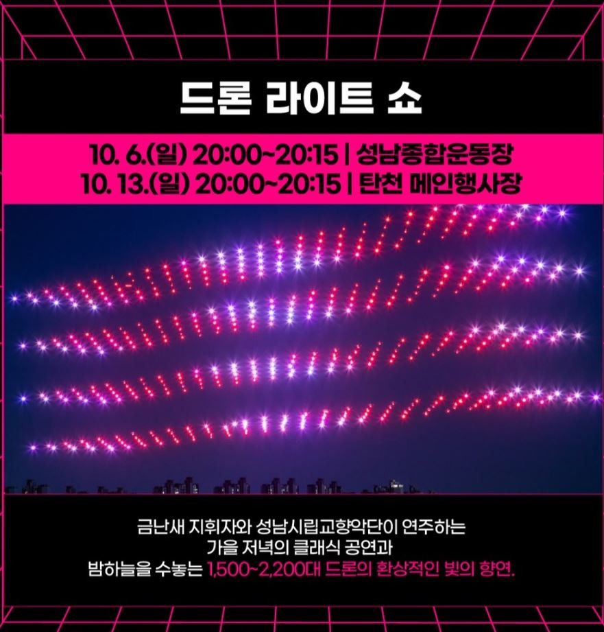 10월 5일 분당중앙공원 야외공연장에서 시민연주자로 구성된 페스티벌 오케스트라의 개막 행사를 시작으로 다이나믹듀오, 원슈타인, 김완선의 무대까지 10월 13일 탄천에서 펼쳐지는 드론 쇼까지 총 9일간 진행합니다.