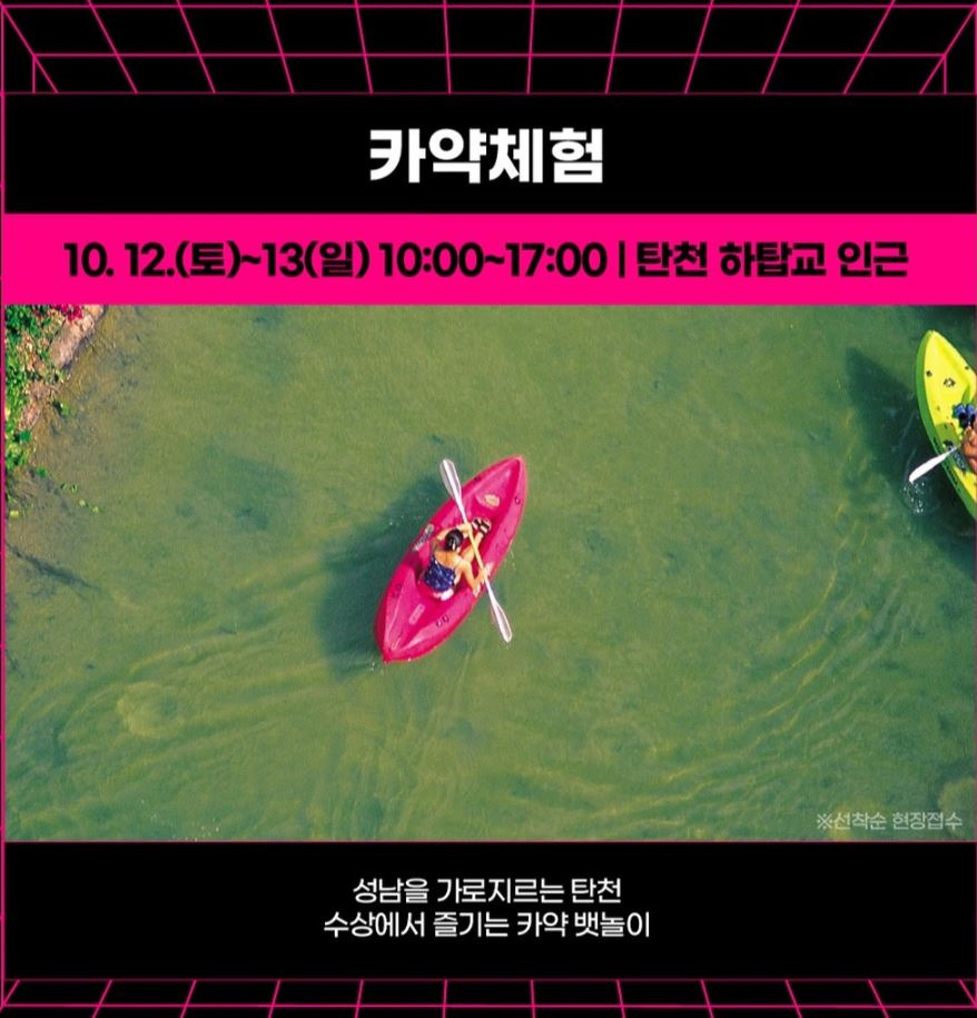 카약 체험, 반려동물 페스티벌, 유소년 드론 축구대회 등 특별한 체험부터 지역예술인 공연, 파크 피크닉 콘서트, 성남시향 등의 예술 프로그램이 준비되어 있습니다.
