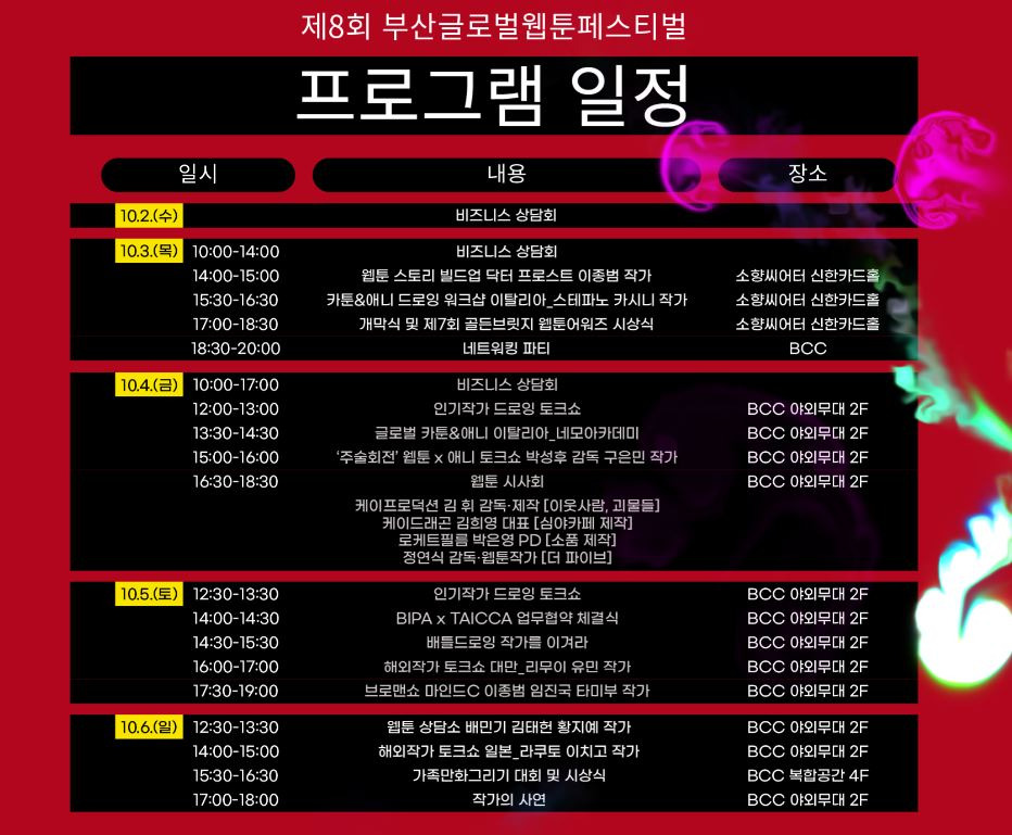 스토리 컨셉을 기반으로 한 웹툰 테마의 전시와 행사를 통해 이야기가 있는 페스티벌인 부산글로벌웹툰페스티벌이 2024년 10월 3일부터 6일까지 소향씨어터 신한카드홀에서 개최합니다.