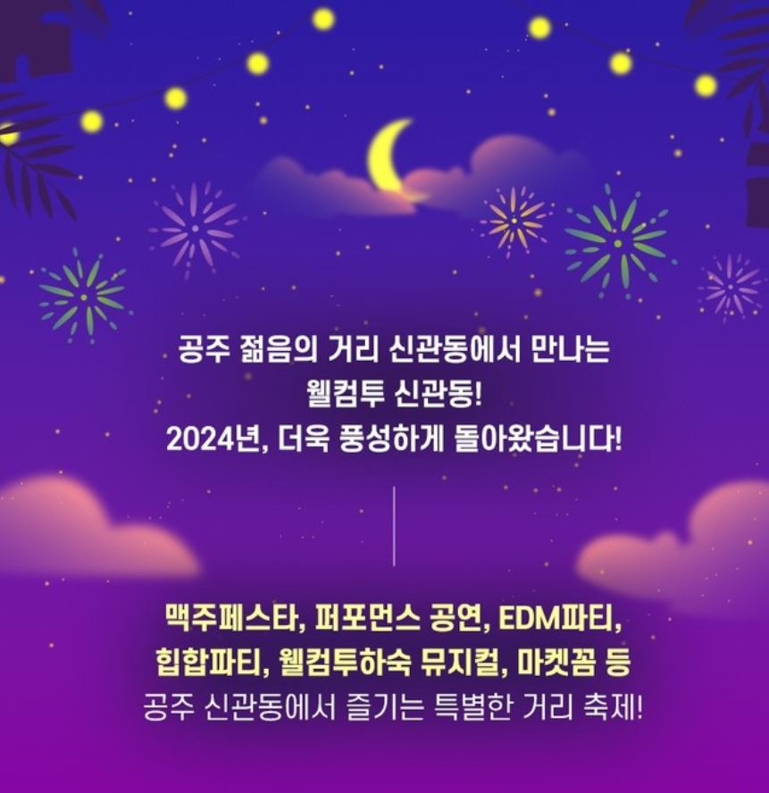 -웰컴투신관동 페스타가 2024년 10월 3일부터 5일까지 공주대학로 감성커피 앞에서 개최-