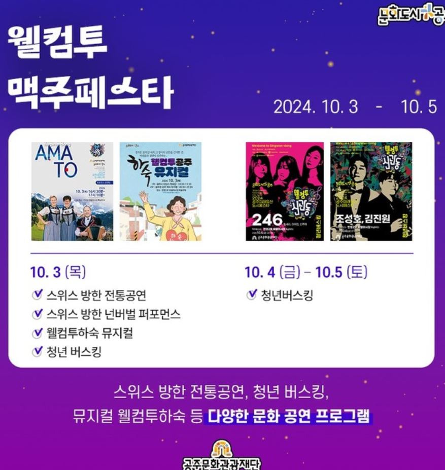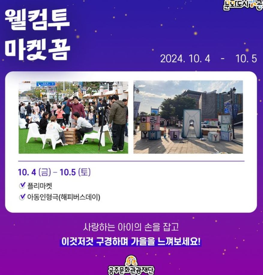 10월 5일 – 웰컴투 공주 맥주페스타, 웰컴투 마켓꼼, 유명 가수 공연(키드밀리,긱스), 거리 퍼포먼스 공연