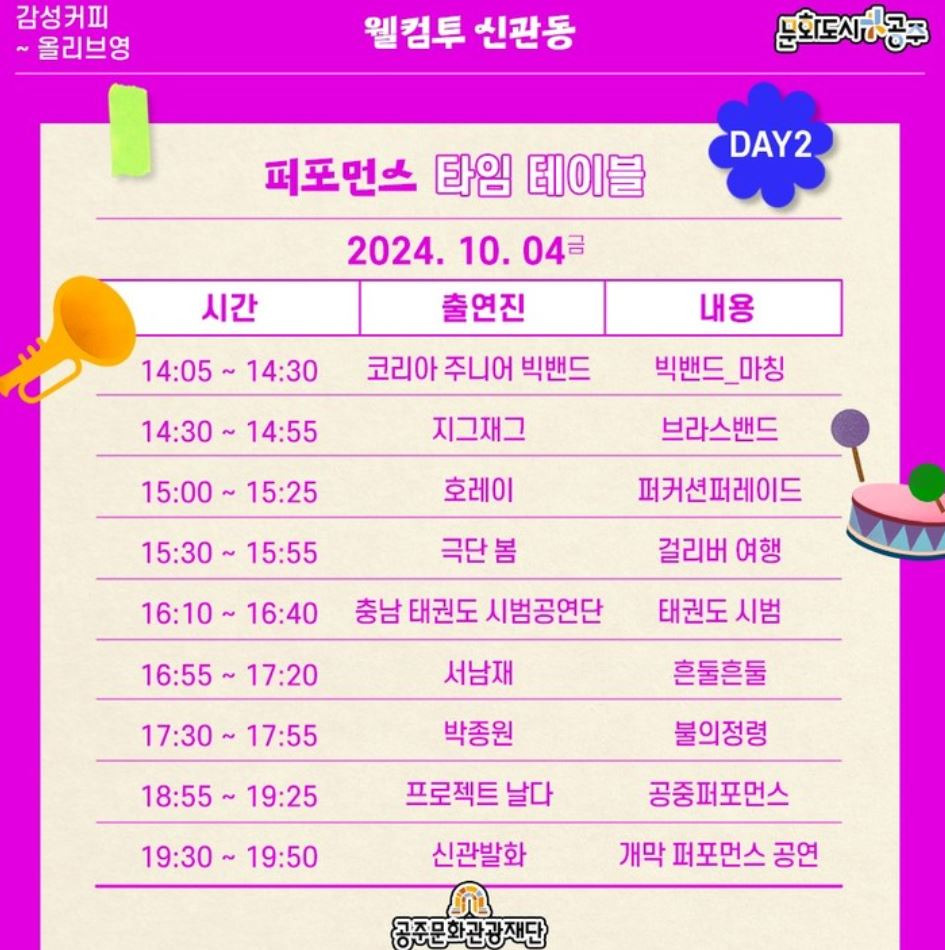 거리영화제, 골목뮤지컬, 골목길 EDM파티, 플리마켓, 체험존, 전시 등 다양한 즐길거리가 준비되어 있는 웰컴투신관동 페스타가 2024년 10월 3일부터 5일까지 공주대학로 감성커피 앞에서 개최합니다.