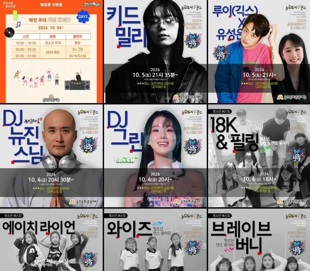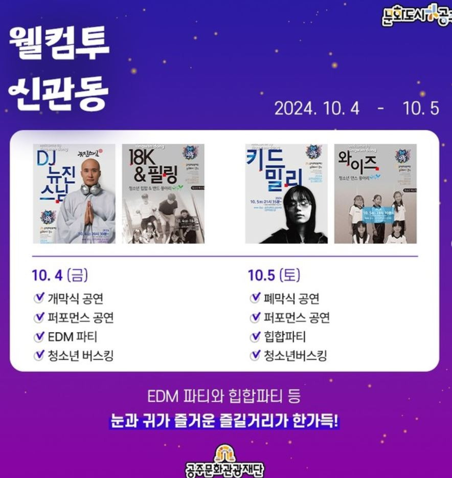 10월 4일 – 웰컴투 공주 맥주페스타, 웰컴투 마켓꼼, EDM 공연(DJ뉴진스님), 거리 퍼포먼스 공연