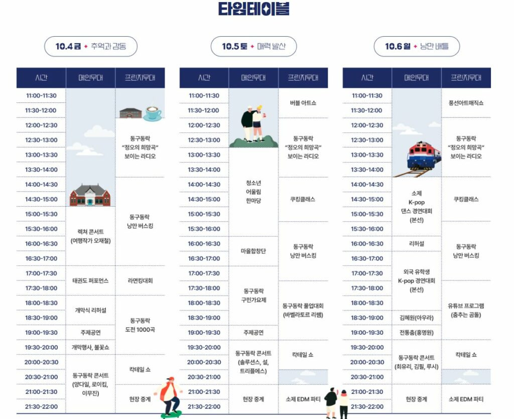 이 외에도 ‘동구동락 정오의 희망곡’, ‘동퀴즈온더블럭’, ‘낭만 거리공연’, ‘소제EDM파티’, ‘동구동락 도전 1000곡’ 등이 진행되며, 루시, 이무진, 로이킴, 김필 등 화려한 라인업의 초대가수를 섭외해 동구동락 음악연주회도 개최된다.
