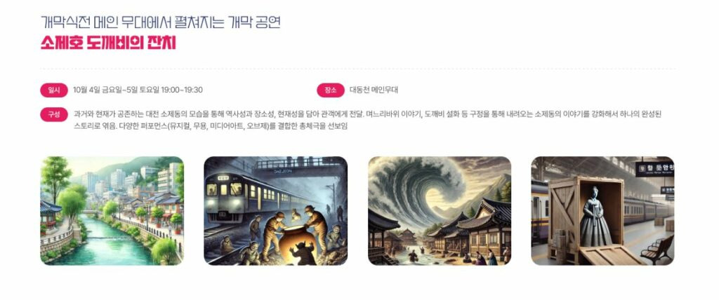 개최 첫날 즐거운 동구 여행을 위해 여행작가 오재철이 전하는 ‘강연 공연’이 시작되며, 소제동 설화를 활용한 축제 주제공연 ‘소제몽’과 함께 ‘불꽃놀이’가 펼쳐져 소제동의 밤하늘을 화려하게 수놓을 예정이다.