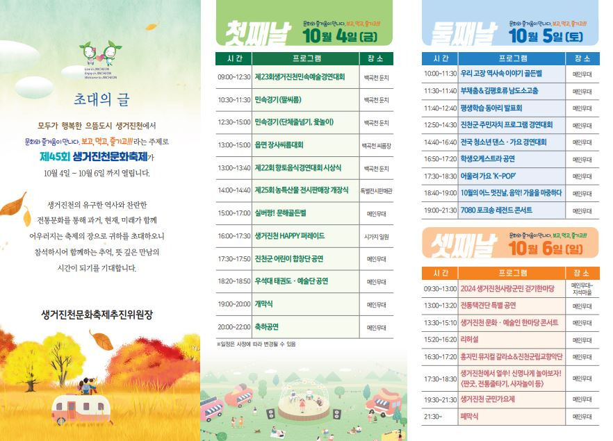 -생거진천문화축제가 2024년 10월 4일부터 6일까지 진천군 진천읍 백곡천 둔치 일원에서 개최-