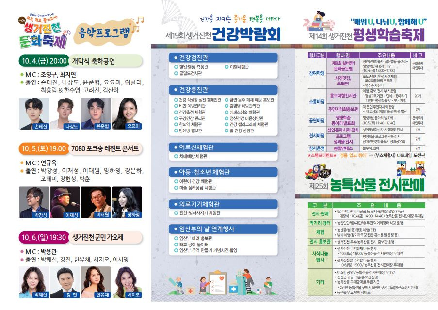 2일차(10.5.토) : 우리고장 역사속 이야기골든벨, 부채춤&김평호류 남도소고춤, 평생학습 동아리 발표회, 진천군 주민자치 프로그램 경연대회, 생거진천 전국 청소년 가요·댄스 경연대회, 학생오케스트라 공연, 어울려 가요 ‘K-POP’, 혼성합창단, 7080 포크송 레전드 콘서트 등