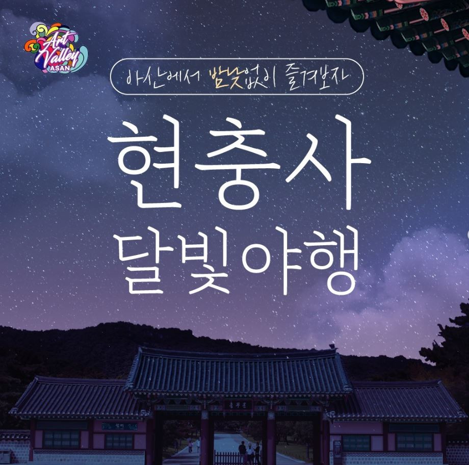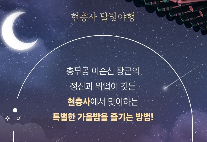 이번 현충사 달빛야행은 평소 닫혀 있는 현충사의 야간개방과 함께 고즈넉한 현충사 밤의 정취를 더할 수 있는 가곡과 아리아의 밤, 국악의 향연 등 격조 높은 공연과 현충사의 연못, 다리 등을 수놓을 야간경관 및 다양한 체험존이 펼쳐진다.