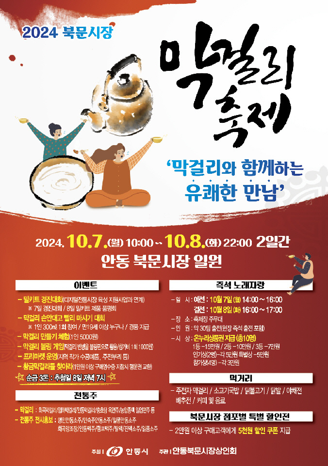 전통시장과 지역주민의 상생을 통해 지역 경제를 활성화하고자 안동시와 북문시장 상인회가 10월 7일(월)부터 8일(화)까지 이틀간 ‘막걸리와 함께하는 유쾌한 만남’이라는 주제로 2024 북문시장 막걸리 축제를 개최한다.