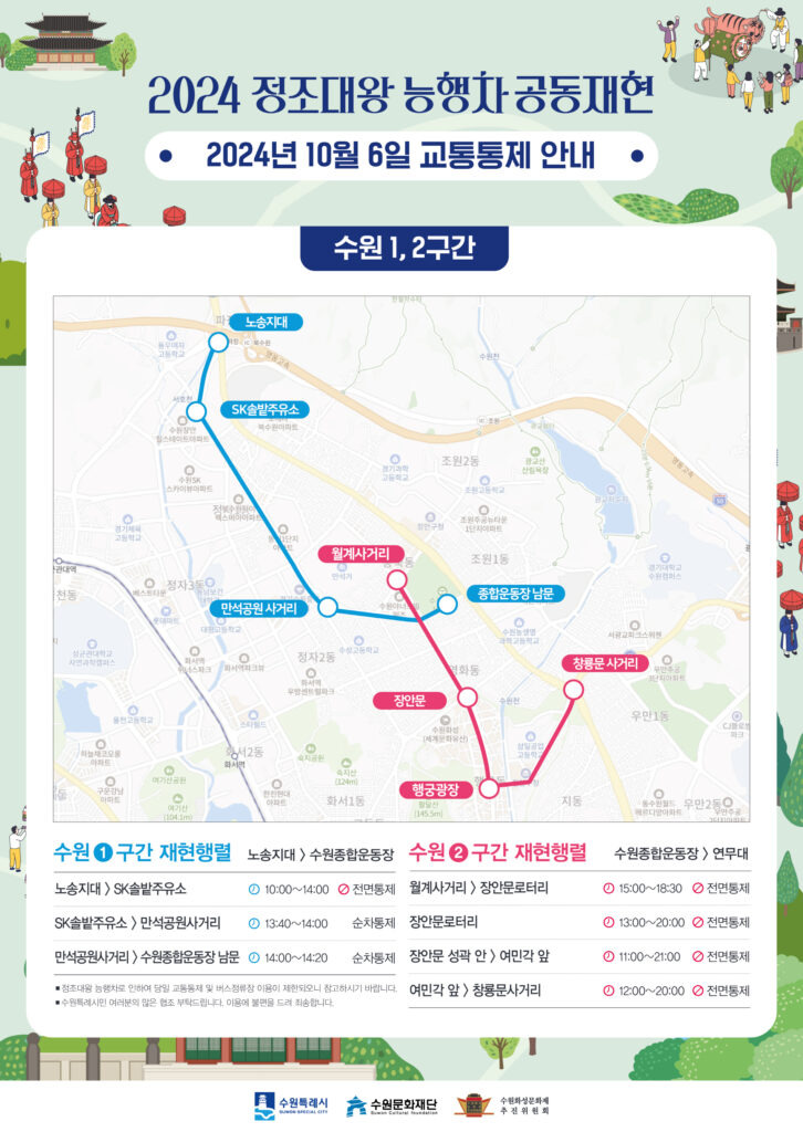 퍼레이드의 백미는 수원2구간인 수원종합운동장부터다. 총 5개의 행렬이 종합운동장부터 여민각까지를 가득 채운다. 이 구간의 주요 거점은 장안문과 여민각이다. 오후 4시부터 본행렬이 지나며 장안문에서는 파발마, 군문의식, 수원유수 정조맞이 등의 의례행사가 이어진다. 해병대 의장대, 경기도립무용단 등 사전공연은 오후 3시20분부터 진행되니 일찌감치 자리를 잡는 게 좋다.