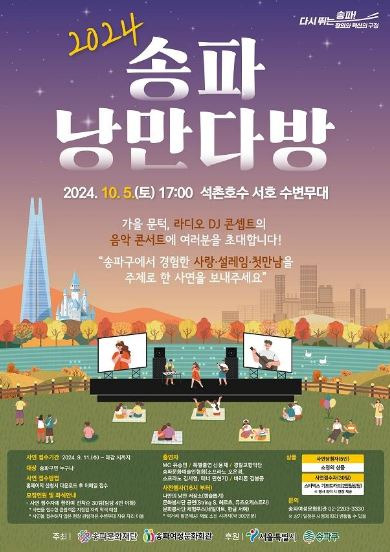 송파구(구청장 서강석)는 오는 5일 17시부터 석촌호수 서호 수변무대에서 가족 페스티벌 ‘2024 송파낭만다방’을 개최한다고 밝혔다.