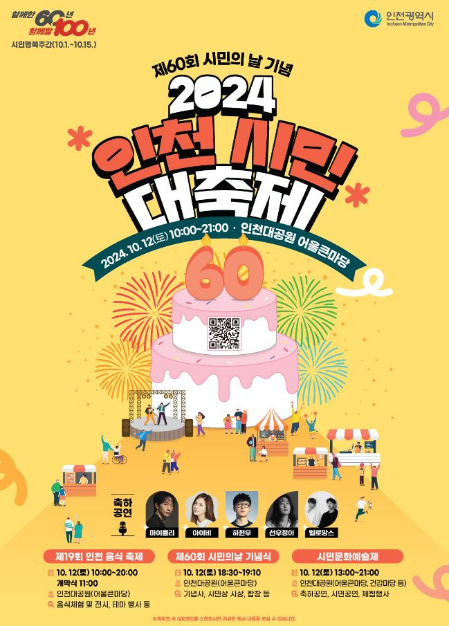 인천광역시는 오는 10월 12일 인천대공원에서 ‘제60회 인천 시민의 날 기념행사’를 개최한다고 밝혔다.
