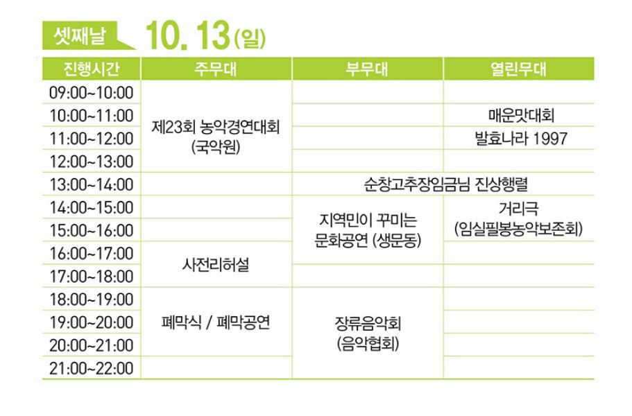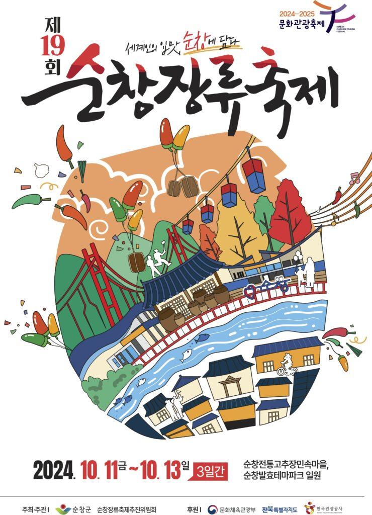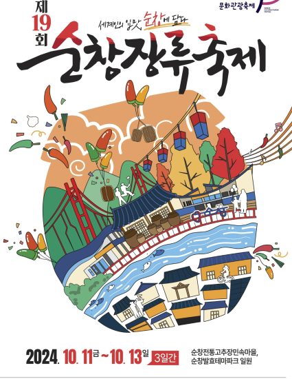 ‘세계인의 입맛, 순창에 담다’를 주제로 열리는 이번 축제는 오는 10월 11일부터 13일까지 3일간 발효테마파크와 순창전통고추장민속마을 일원에서 펼쳐진다