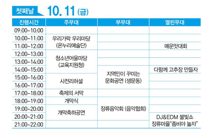 축제와 공연 세부내용은 축제주관기관으로 문의하여 주시길 바랍니다.