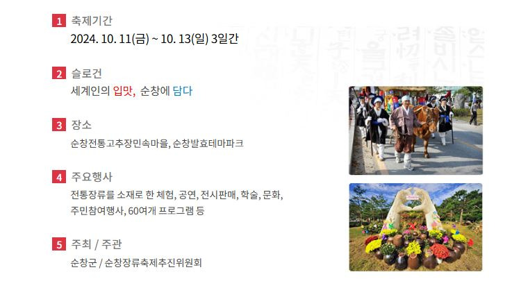 한편, 순창장류축제는 매년 10만 명 이상의 관광객이 찾는 문화관광 대표 축제로 자리 잡았으며, 올해 축제 역시 한국 전통 발효식품의 우수성을 알리고, 지역의 먹거리와 문화를 즐길 수 있는 종합 문화 축제가 될 것으로 기대된다.