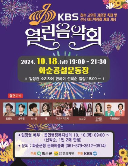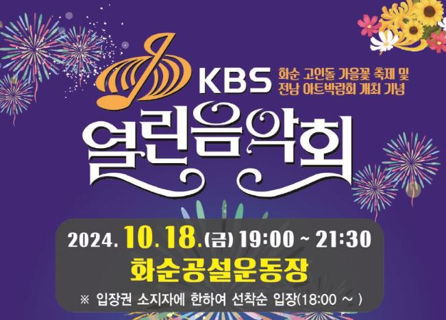 화순군(군수 구복규)은 오는 10월 18일(금) 오후 7시 화순 공설운동장 특설무대에서 ‘화순 고인돌 가을꽃 축제 및 전남 아트박람회 ART 061’을 기념하기 위한 ‘화순군민과 함께하는 KBS 열린음악회’를 개최한다고 밝혔다.