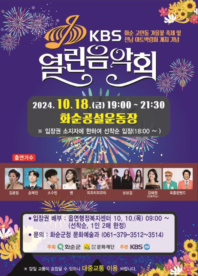 구복규 화순군수는 “화순 고인돌 가을꽃 축제 및 전남 아트박람회 ART 061 개최 기념 ‘KBS 열린음악회’에 화순군민과 인근 지역 주민들을 초청하고자 한다”라며, “음악회와 가을꽃 축제를 함께 즐길 수 있는 자리가 되길 바란다”라고 말했다.