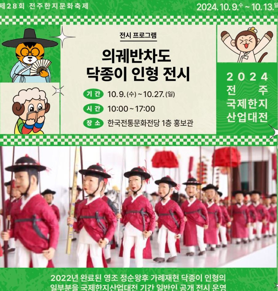 전주종합운동장에서 진행되는 국제종이문화기획전, 한지현대공예기획전, 제30회 전국한지공예대전 초대작가전, 외규장각 의궤반차도 닥종이 인형 전시회 등입니다.