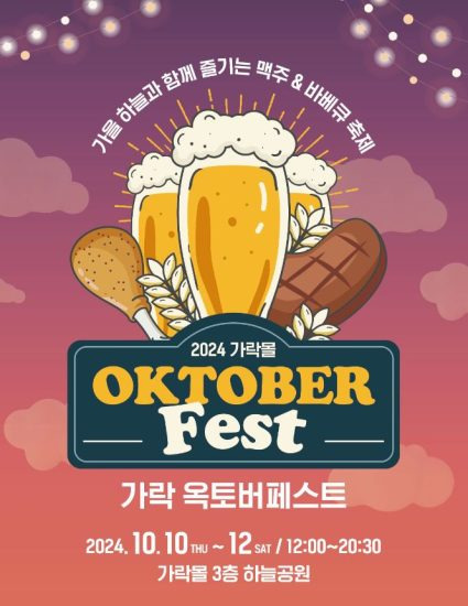전국 각지 농수산물이 모이는 서울시 송파구 가락몰 하늘공원에서 낭만있는 캠핑, 수제맥주와 바베큐 그리고 가락시장에서 맛볼 수 있는 꽃,전,대(꽃게,전어,대하)까지! 서울 도심에서 즐기는 루프탑 야외축제 가락옥토버페스트 캠핑축제가 2024년 10월 10일부터 12일까지 개최합니다.