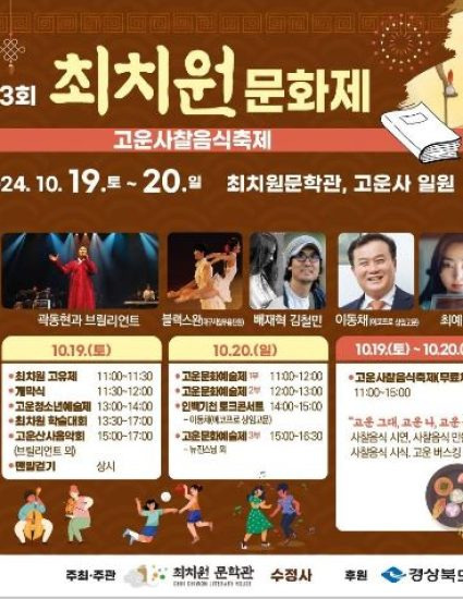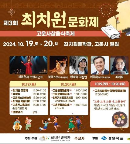 고운사찰 음식 축제와 함께 진행되는 제3회 최치원 문화제가 2024년 10월 19일부터 20일까지 2일간 최치원문학관 및 고운사 일원에서 개최합니다.