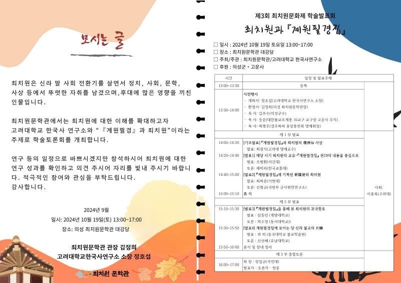 최치원문학관에서는 최치원에 대한 이해를 확대하고자 고려대학교 한국사 연구소와 계원필경 최치원이라는 주제로 학술토론회를 개최합니다.