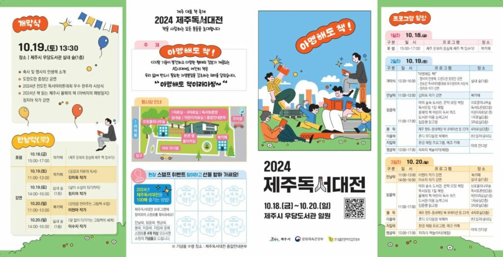 제주시는 오는 10월 18일부터 20일까지 우당도서관 일원에서 디지털 시대에도 책은 우리 삶에 반드시 필요한 자양분임을 강조하는 “아멩해도 책!”을 주제로 2024년 제주독서대전을 개최한다.