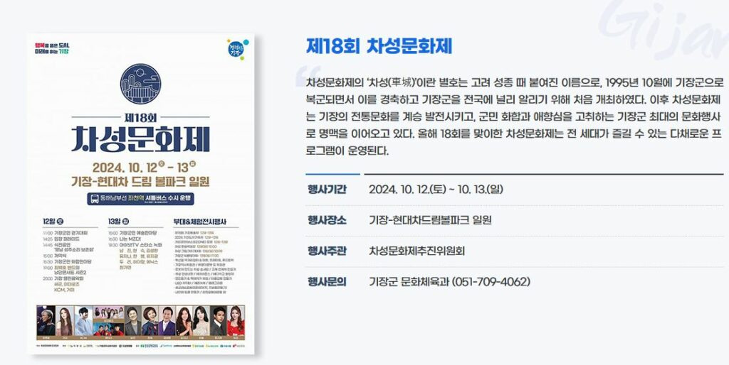 기장의 전통문화를 계승발전시키고, 군민 화합과 애향심을 고취하는 기장군 최대의 문화행사로 명맥을 이어오고 있는 차성문화제가 2024년 10월 12일부터 13일까지 기장 현대차 드림 볼파크 일원에서 개최합니다.