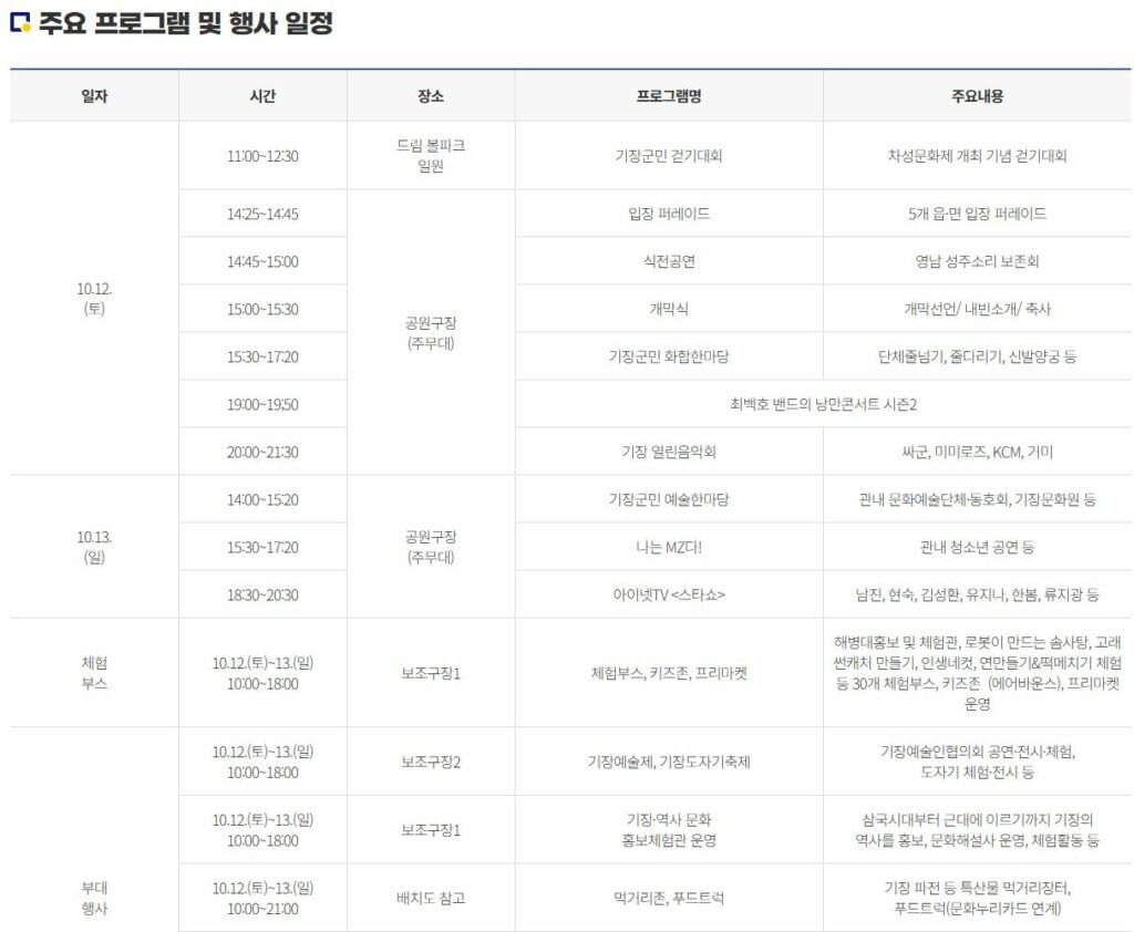 기장예술제, 기장도자기축제, 기장역사문화홍보관, 먹거리장터 및 푸드트럭존 운영(문화누리카드 연계)될 예정입니다.
