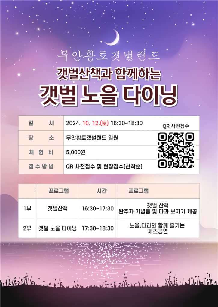 무안황토갯벌랜드에서는 오는 12일 아름다운 가을 갯벌의 낮과 밤을 즐길 수 있는 ‘갯벌 노을 다이닝’ 행사를 운영한다.