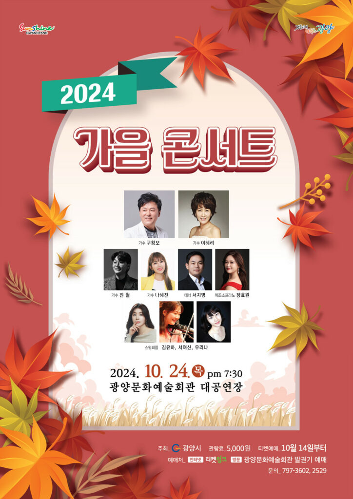 김명덕 문화예술과장은 “2024 가을 콘서트는 풍성한 가을 시민들께 안겨드리는 종합선물세트 같은 공연이 될 것이다”라며 “일상에 지친 시민들이 활력을 재충전할 수 있도록 앞으로도 다채로운 공연을 선보이겠다”라고 밝혔다.