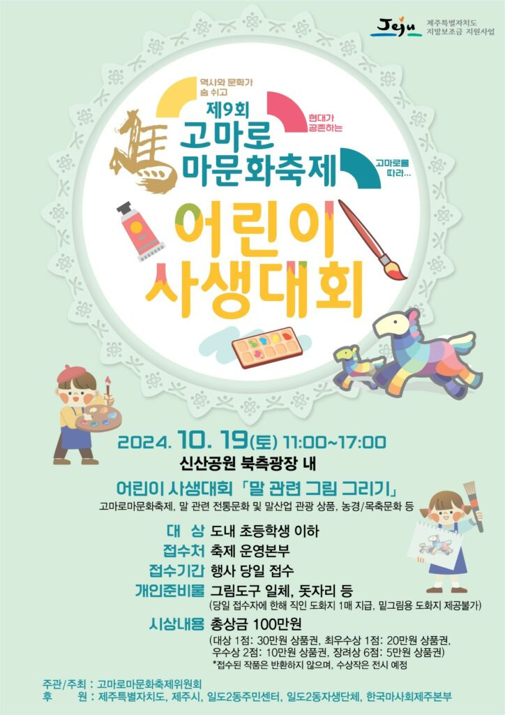 고마로馬문화축제를 통해 제주의 결속과 화합의 장을 마련하고 문화적 가치화 지역자원을 홍보할 수 있는 계기를 마련하고자 제9회 고마로 마문화축제가 2024년 10월 19일부터 20일까지 개최합니다.
