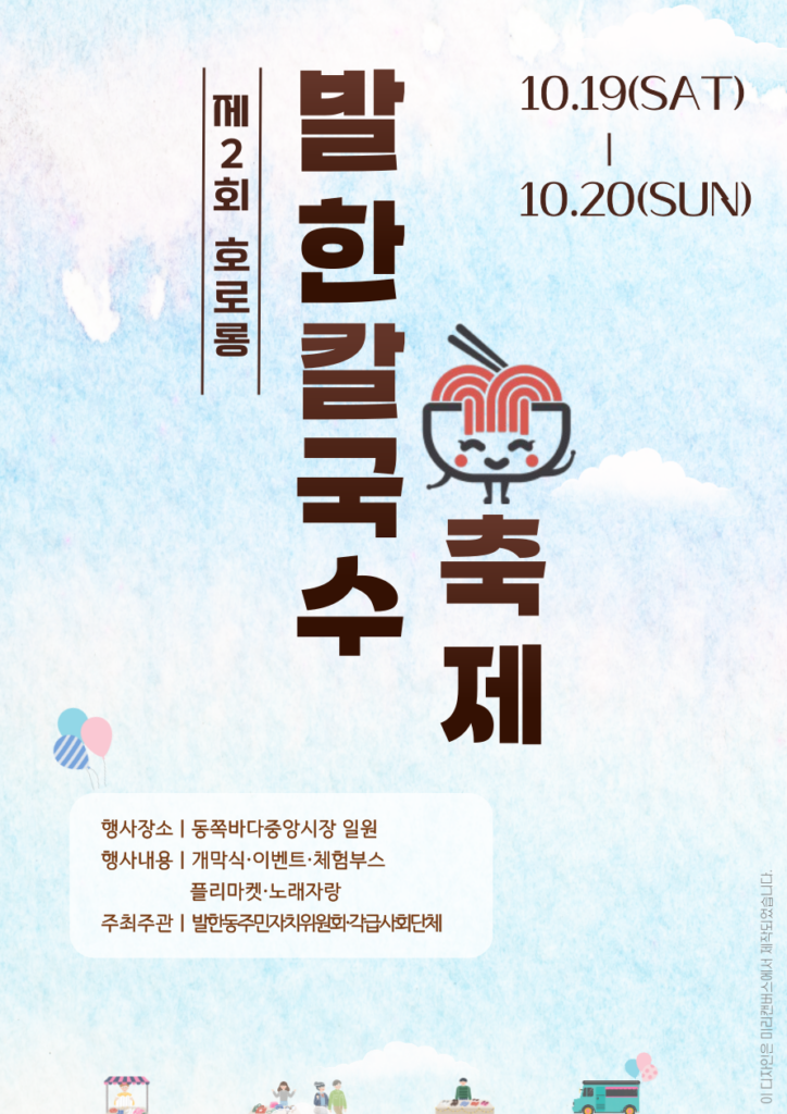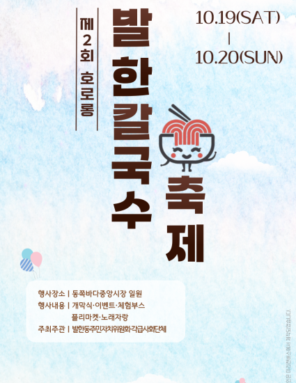 제2회 발한칼국수 축제가 2024년 10월 19일부터 10월 20일까지 이틀간 동쪽바다중앙시장 일원에서 개최됩니다.