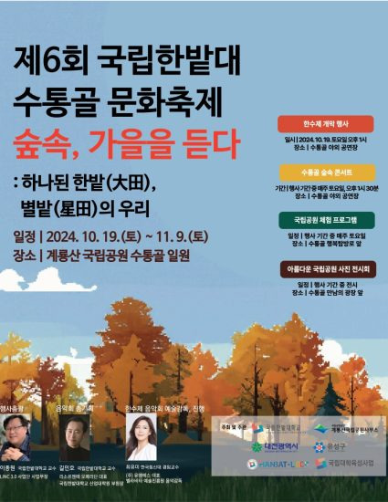 대학과 지자체, 국립공원, 지역민이 하나가 되는 제6회 국립한밭대 수통골 문화축제가 2024년 10월 19일부터 11월 9일까지 계룡산국립공원 수통골 일원에서 개최합니다.
