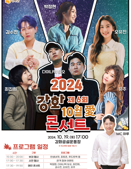 강화군은 오는 19일(토) 오후 5시 강화공설운동장특설무대에서 ‘2024년 제6회 강화 10월애(愛) 콘서트’를 개최한다.