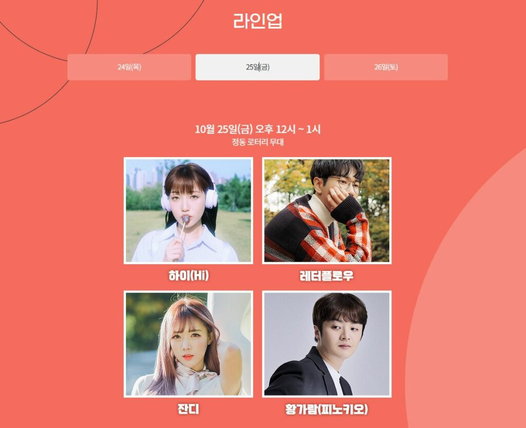 10월24일(목)~25일(금) 오후 12시~1시, 10월26일(토) 오후 2시~4시 유명가수들의 공연이 정동 로터리 무대에서 열립니다.