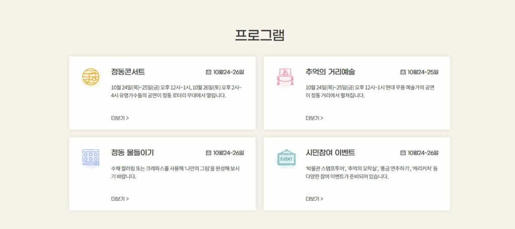 ‘정동의 사계’, 정동 일대 명소 31곳의 사진과 채색화 등 ‘정동의 추억’을 공유하시길 바랍니다. 정동문화축제 홈페이지에서 볼 수 있습니다.