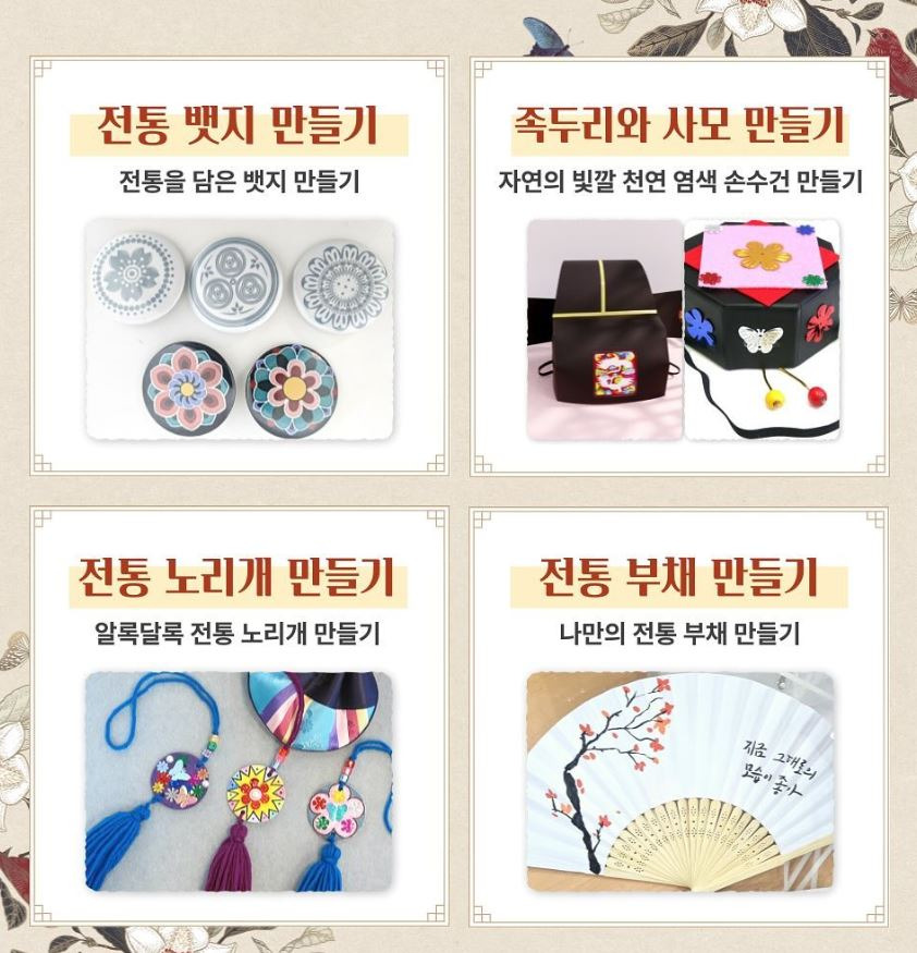 전통한복 패션쇼, 현대한복 패션쇼, 반려동물한복 패션쇼, 어린이한복 패션쇼, 전통예술 공연, 생활문화예술인 공연, 한복 체험, 한복 전시, 천연 염색 손수건 만들기, 다도 체험, 전통 부채 만들기, 삼베 주머니 만들기, 뱃지 만들기, 전통 노리개 만들기, 저통 매듭 공예, 족두리와 사모 만들기, 전통놀이 체험, 포토존이 운영됩니다.