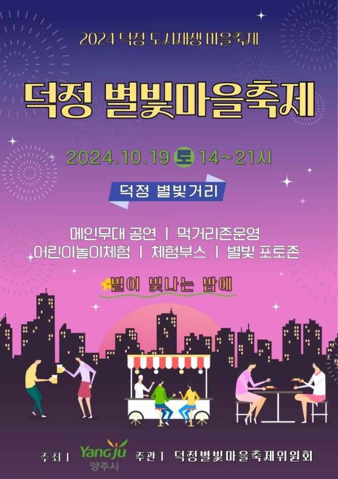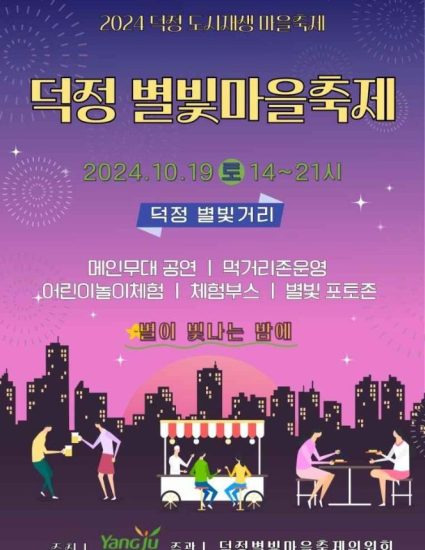 덕정 도시재생뉴딜사업의 일환으로 공동체 화합과 지역 상권활성화를 위해 개최되는 덕정 별빛마을축제가 2024년 10월 19일에 덕정 별빛 거리 일원에서 개최합니다.