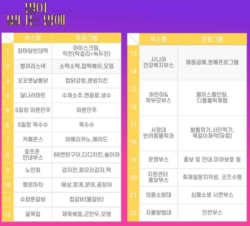 먹거리장터, 아이와 가족들을 위한 흥미롭고 신나는 체험, 별빛 포토존·보물찾기 등 프로그램이 진행됩니다.